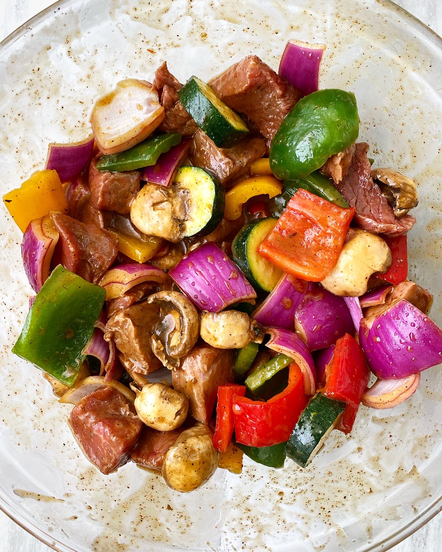 - Vegetables: Use 1.5 pounds of your preferred kabob ingredients. What you see here is bell peppers, mushrooms, red onion, and zucchini. Other suggestions include cherry tomatoes or even fresh garlic cloves.