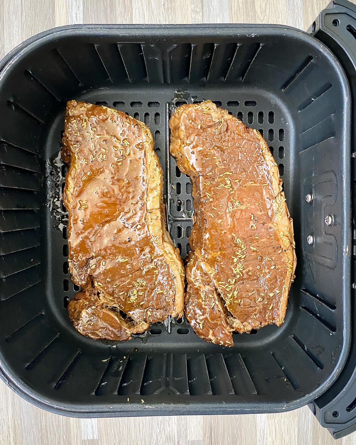- When ready to cook, remove the steaks from the marinade and add to the air fryer basket. Discard the remaining marinade.