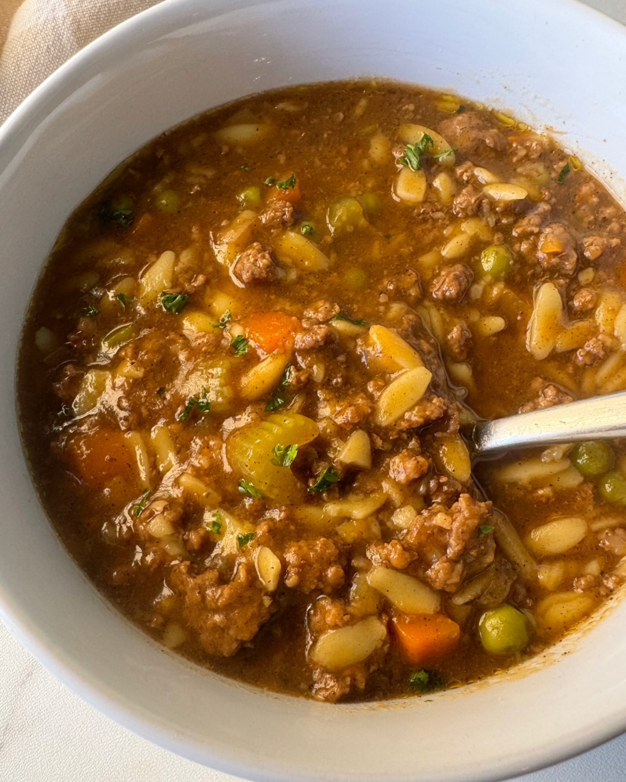 This crockpot beef pumpkin orzo soup is a tasty & comforting soup that’s perfect for the autumn & winter seasons. Ground beef, orzo pasta, sage, cinnamon, pumpkin…this soup is the embodiment of fall in a bowl. Instructions to make this easy beef soup in the Instant Pot are also included.