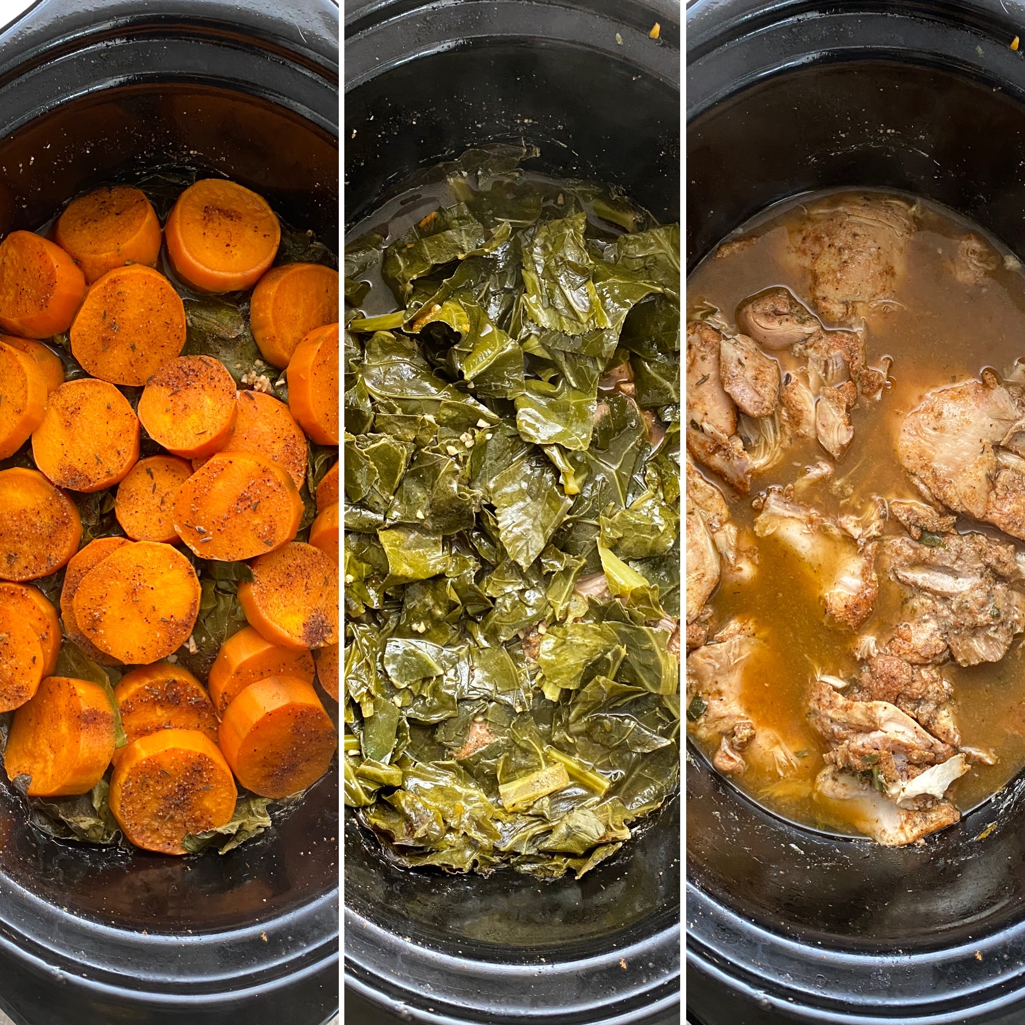 - Add the greens on top of the seasoned chicken. Add the garlic. Pour the apple cider vinegar and chicken broth on top. Add the sweet potatoes on top of the greens.
