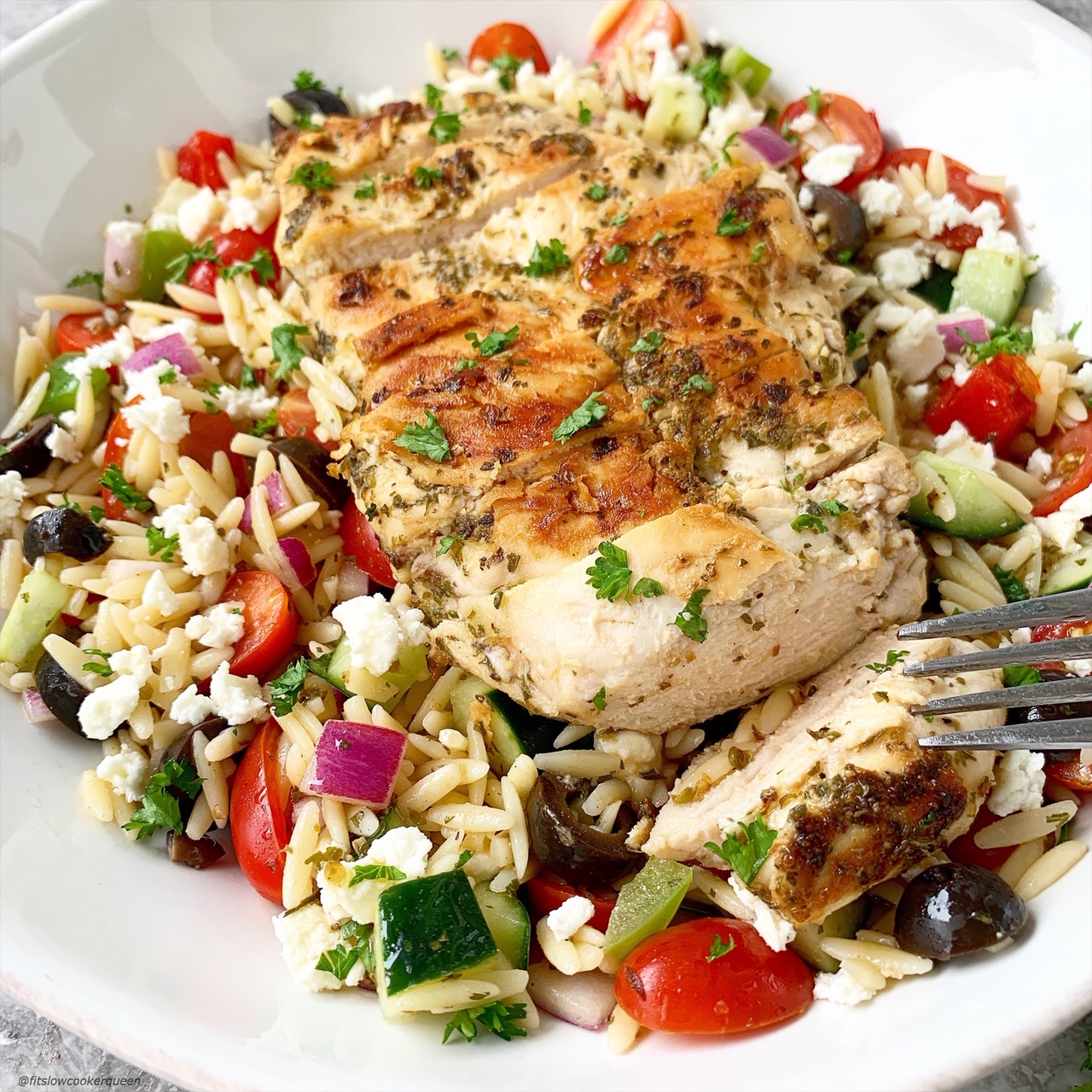 This Greek inspired dish uses a homemade dressing for both the chicken marinade and pasta salad dressing. Make this recipe in under 30 minutes.