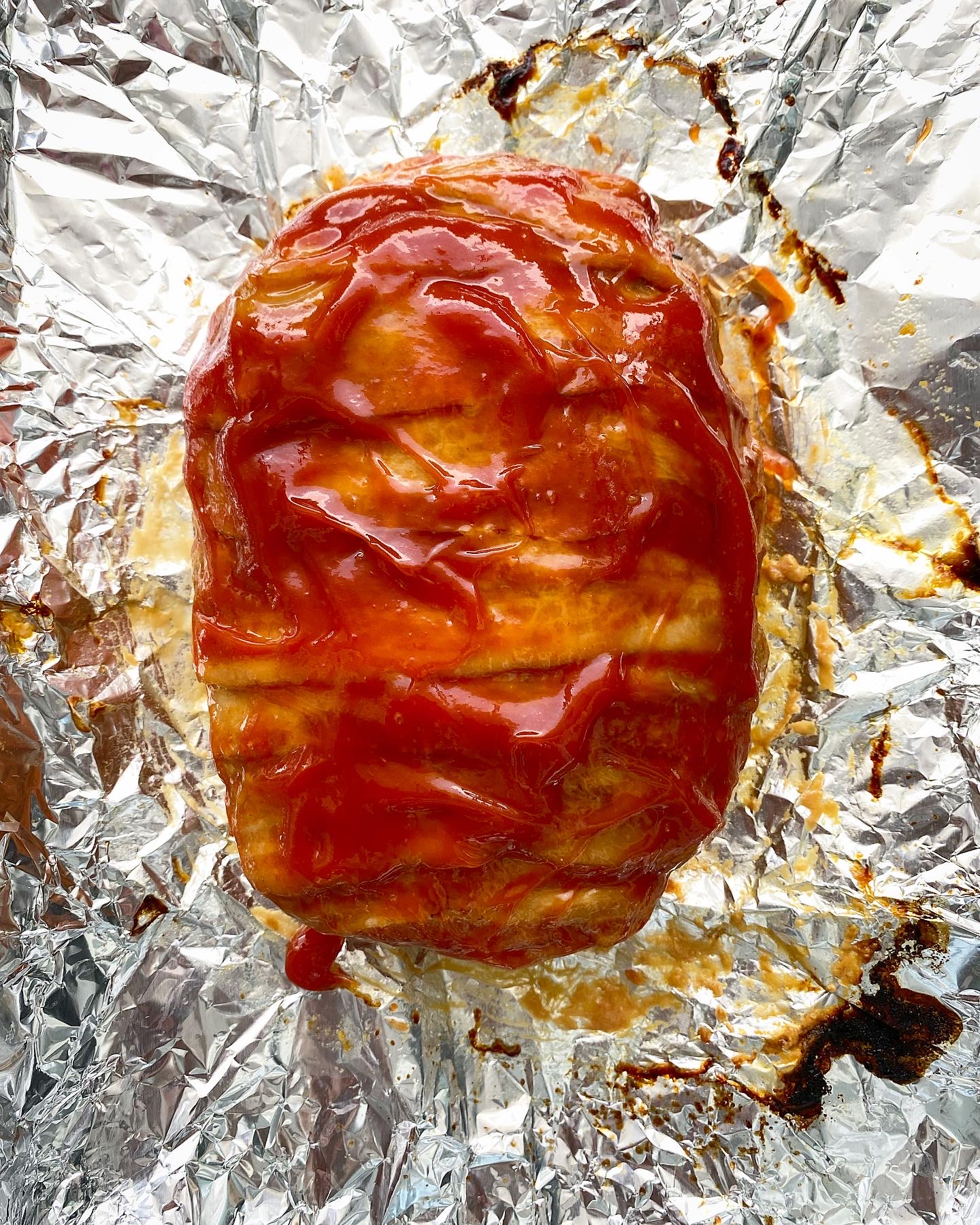 As you can see in the after pic, the bacon will not be crisp when the this bacon wrapped meatloaf is done cooking in your slow cooker or Instant Pot. As a final step, I recommend you remove the meatloaf from the appliance and place it under the broiler. This is when you will add the ketchup which I also highly recommend. Spread the ketchup on top and pop it in the oven under the broiler for a few minutes. This step is easy to do if you cook the meatloaf in the foil, you just carefully pull it out.
