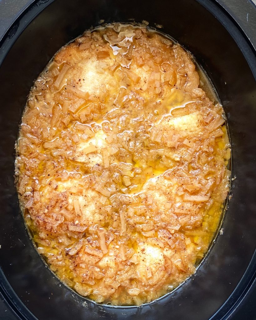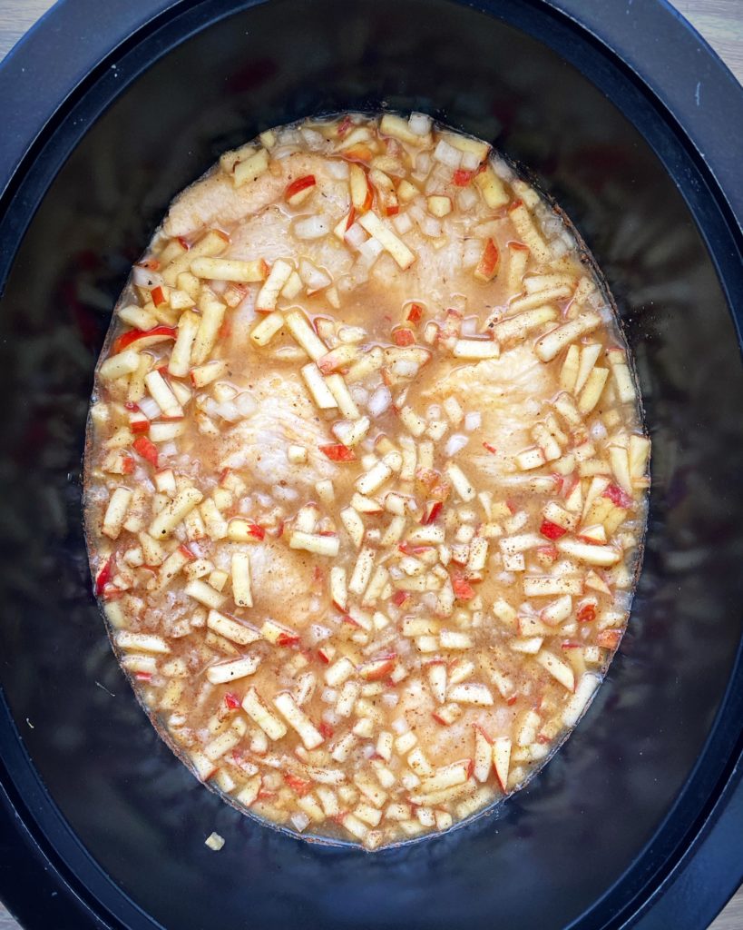 - If using potatoes, add those to the bottom of the slow cooker. Add the chicken. Spread diced apples on top of the chicken.