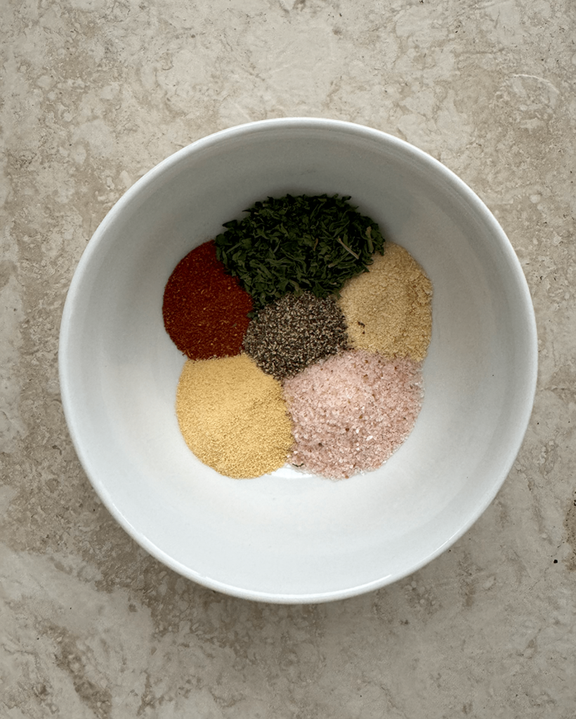 - Seasonings: salt, pepper, parsley, garlic powder, onion powder, paprika
