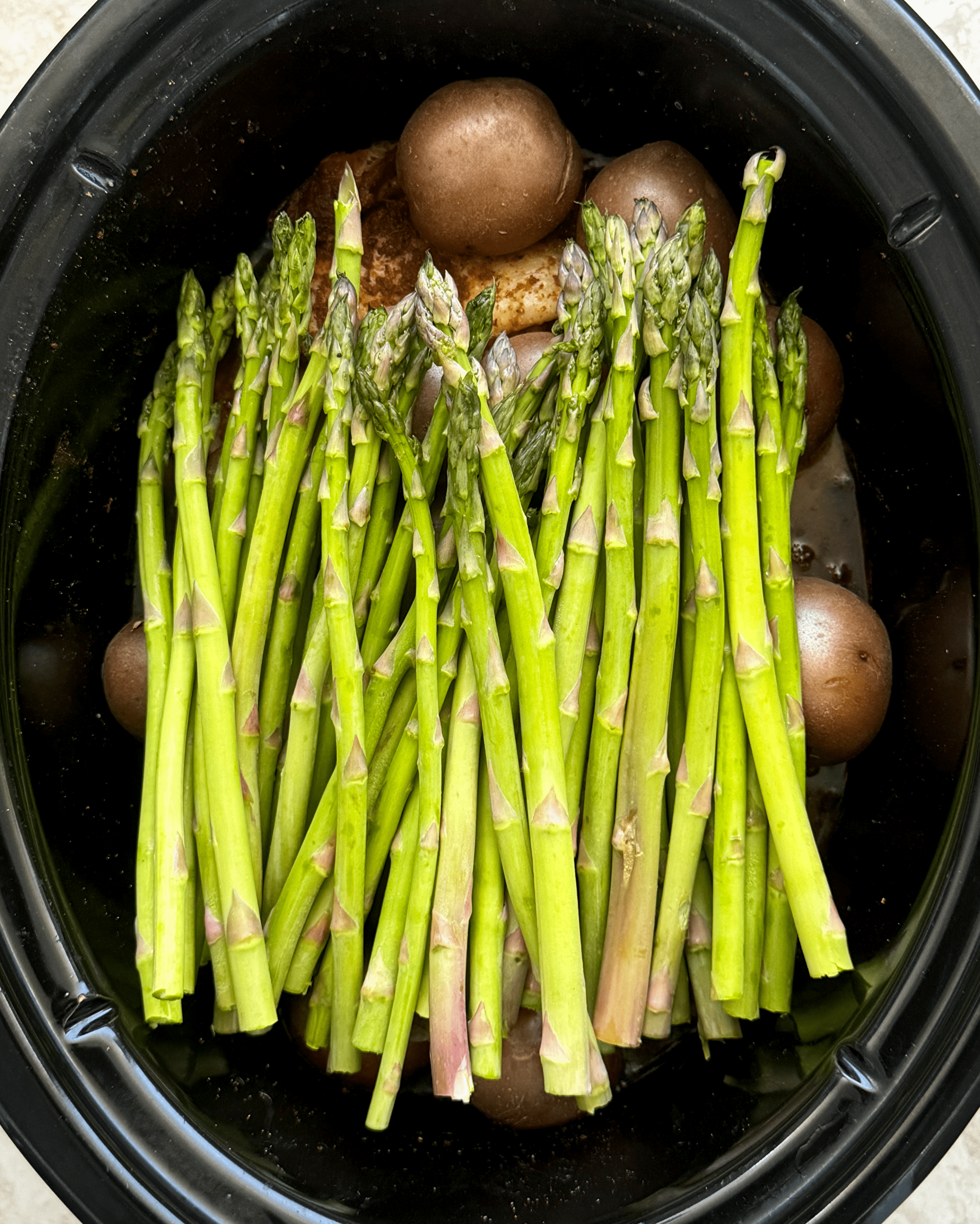 - The last 30 minutes of cooking time, add the asparagus or green beans.