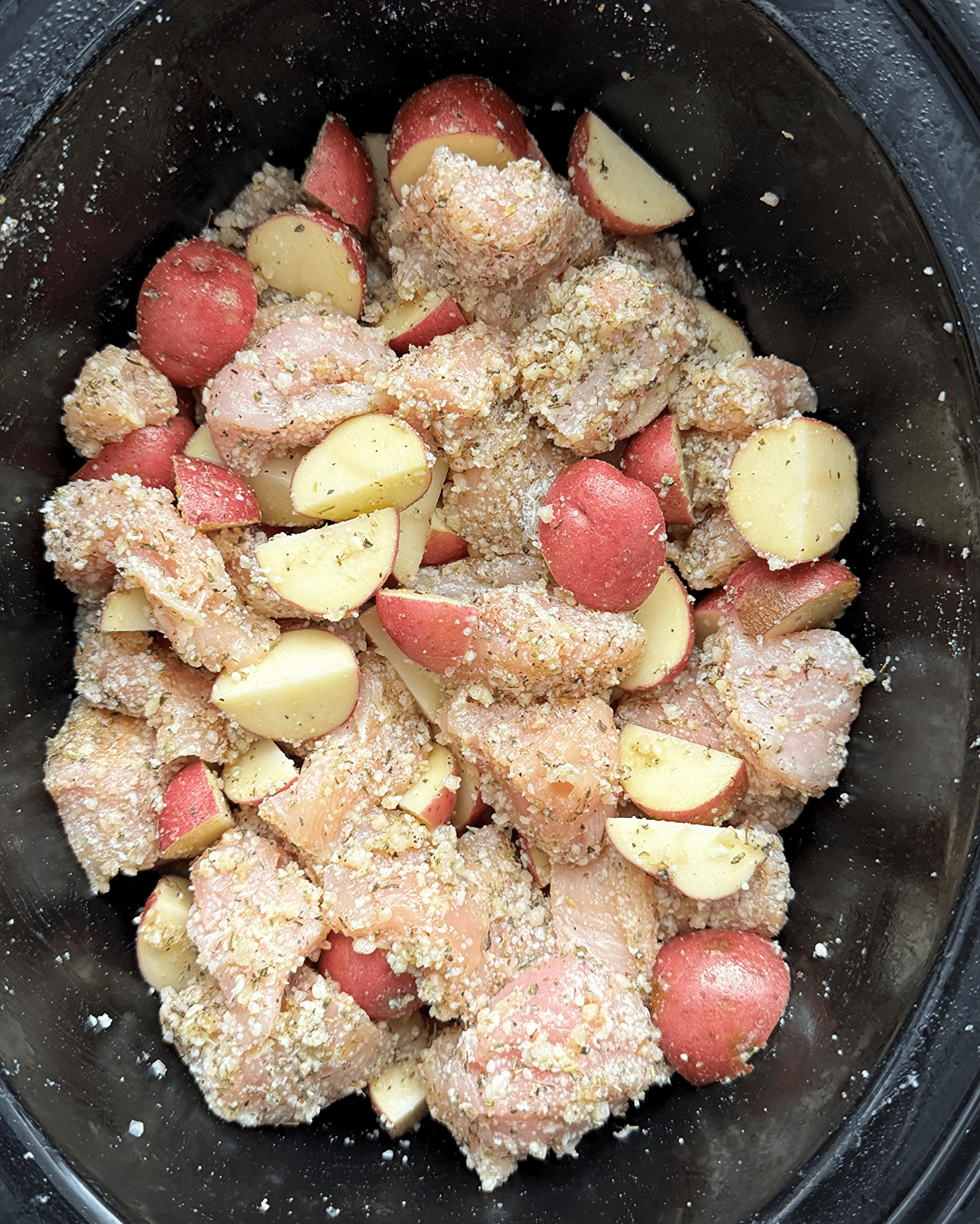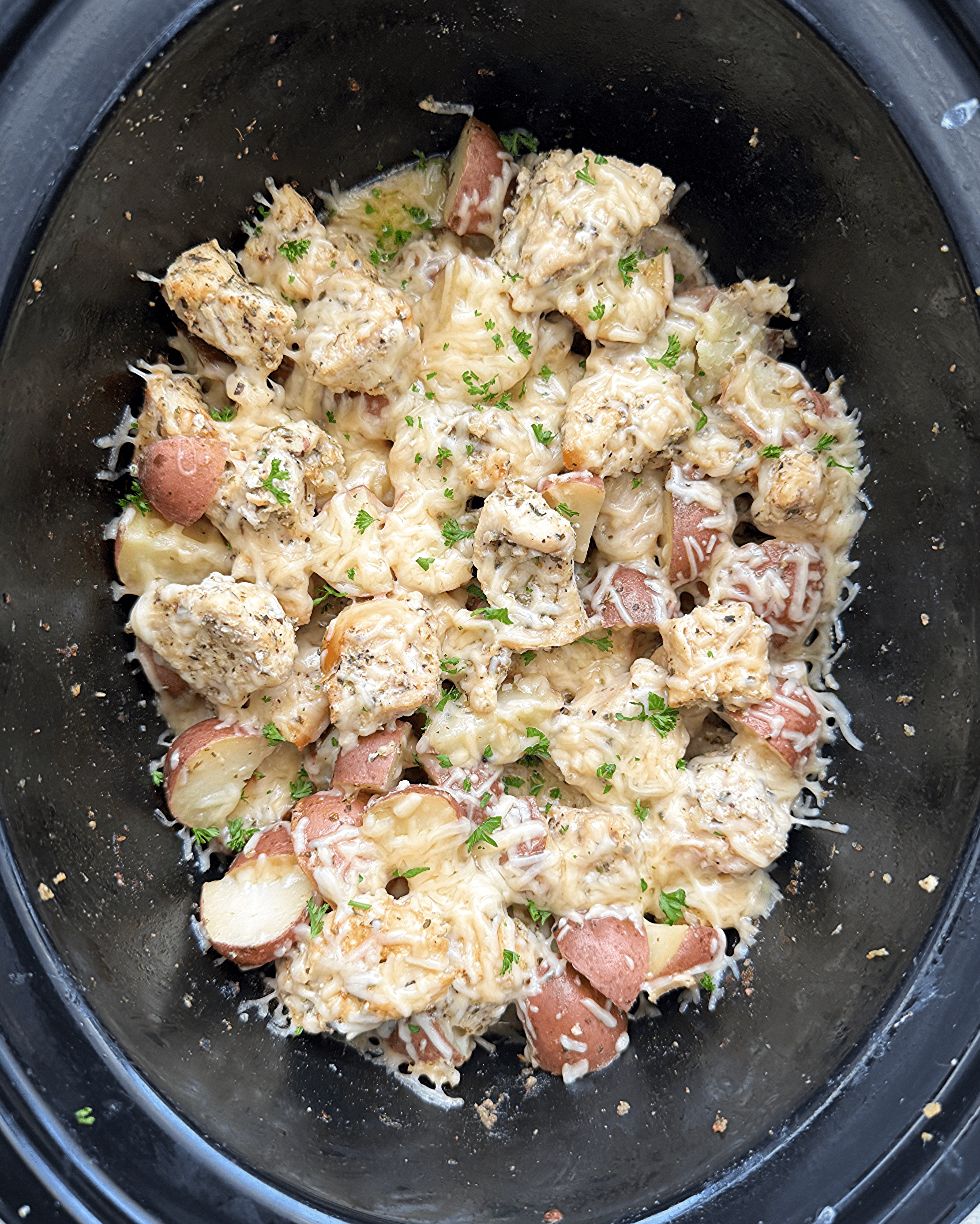 Crockpot garlic Parmesan chicken and potatoes is an easy yet comforting dish that the entire family will enjoy. Chunks of chicken slow cook with minced garlic, garlic powder, grated and shredded Parmesan cheese. This cheesy chicken recipe will have people coming back for more! Instructions to make this garlicky recipe in the Instant Pot are also included.