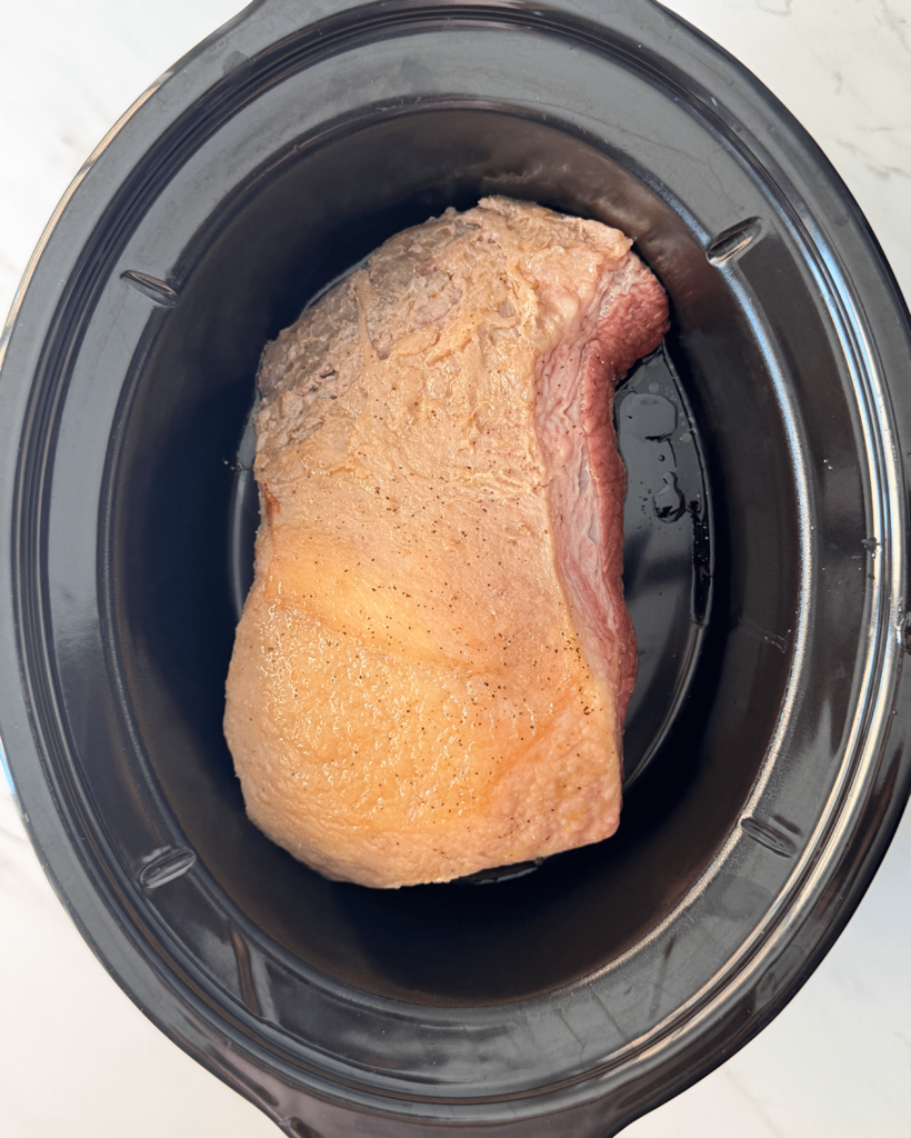 Optional step – Heat oil in a large skillet over medium-high heat. Season the brisket generously salt & pepper. Add the brisket to the heated pan & cook 2-3 minutes on each side or until browned. Remove the brisket from pan and add it to the slow cooker. Do not add any other ingredients or liquid.