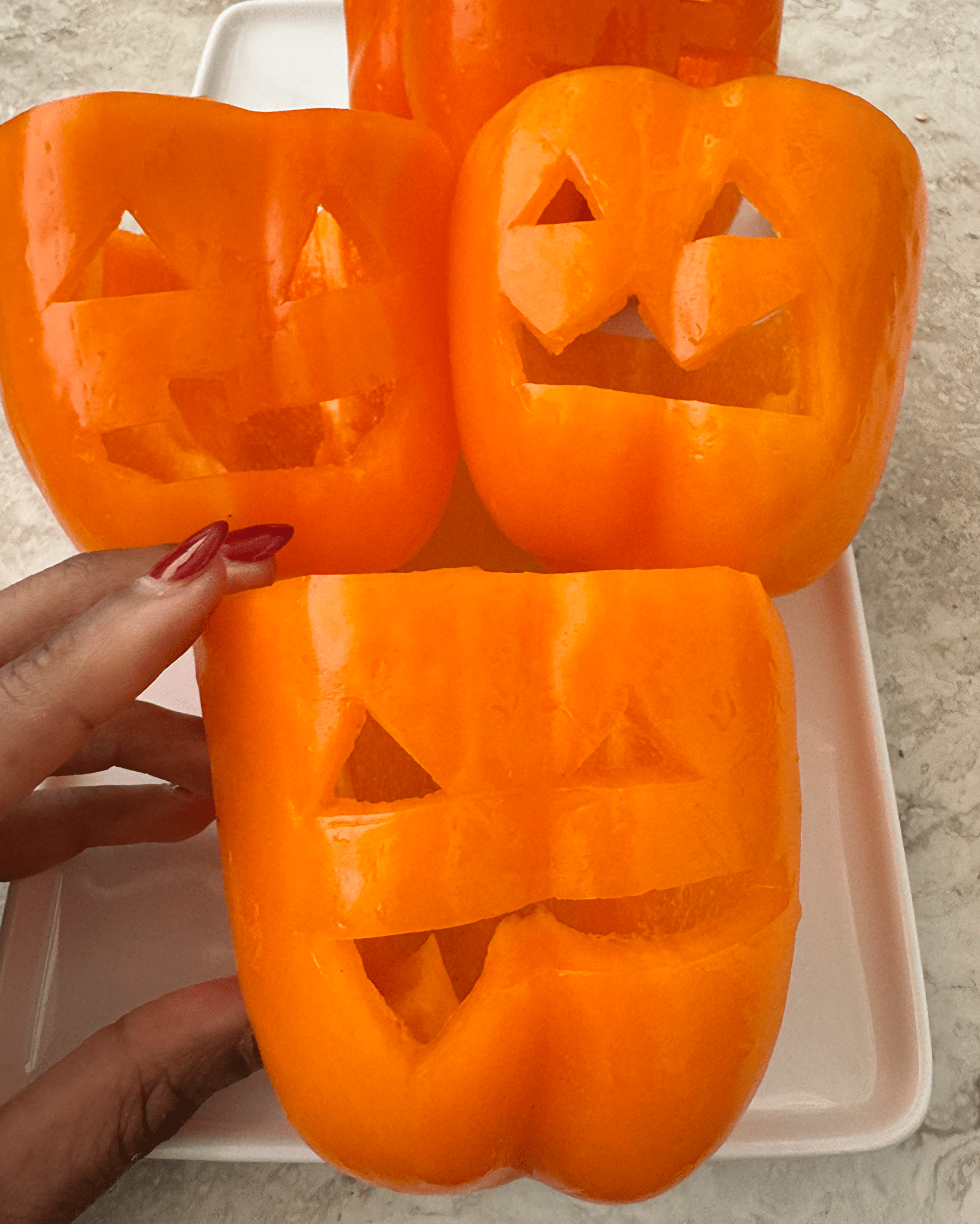 - Slice the top off of each bell pepper. Hollow out the bell pepper by removing all the seeds and membranes. Using a sharp knife, cut jack-o’-lantern faces on one side of each pepper.