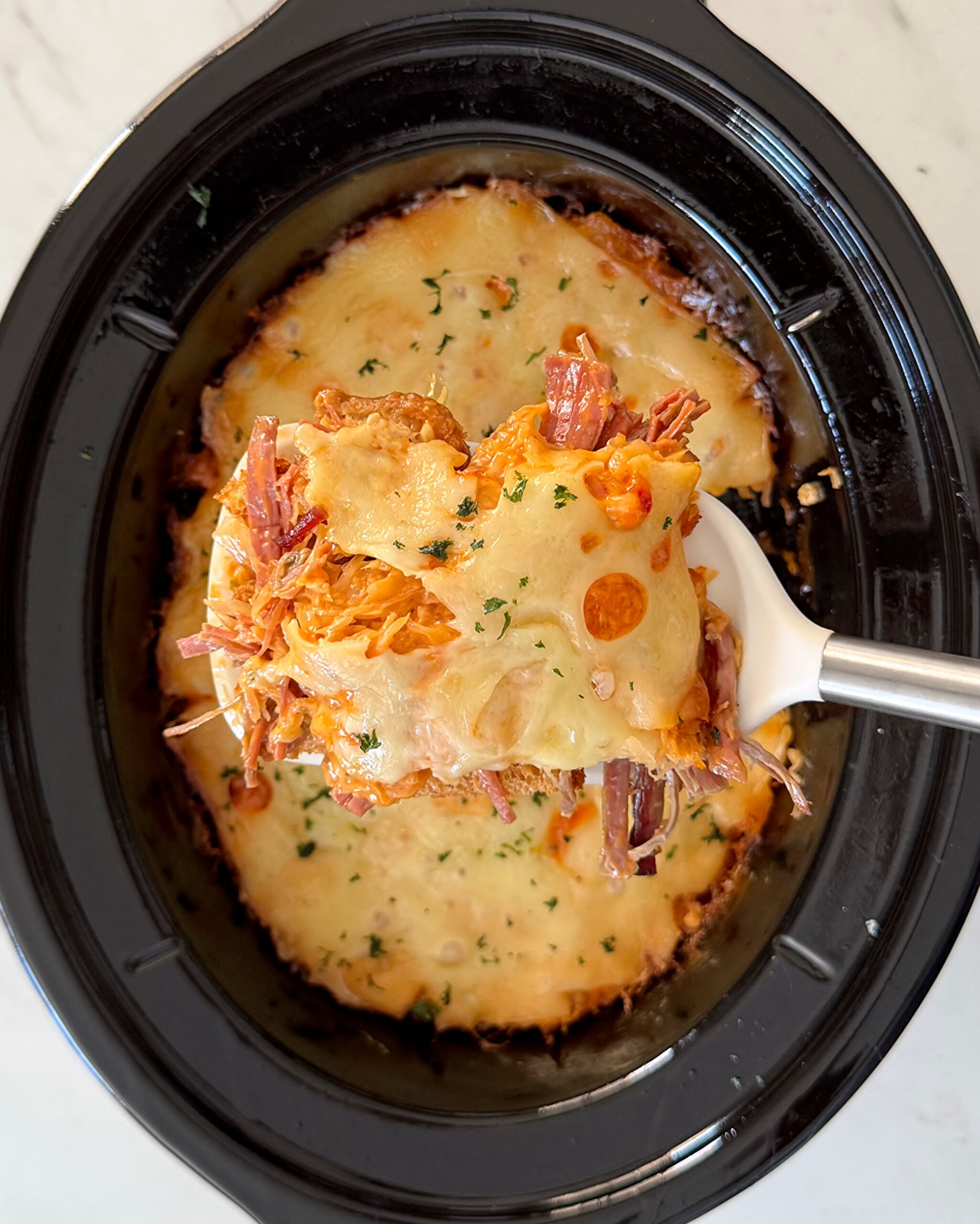 overhead shot of cooked Reuben Casserole in a black slow cooker with a piece missing