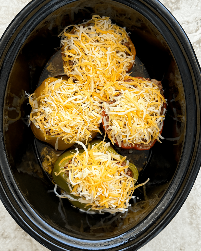 4. The last 5 minutes of cooking time, add shredded cheese evenly across the top of each bell pepper. Cover and cook until cheese is melted.