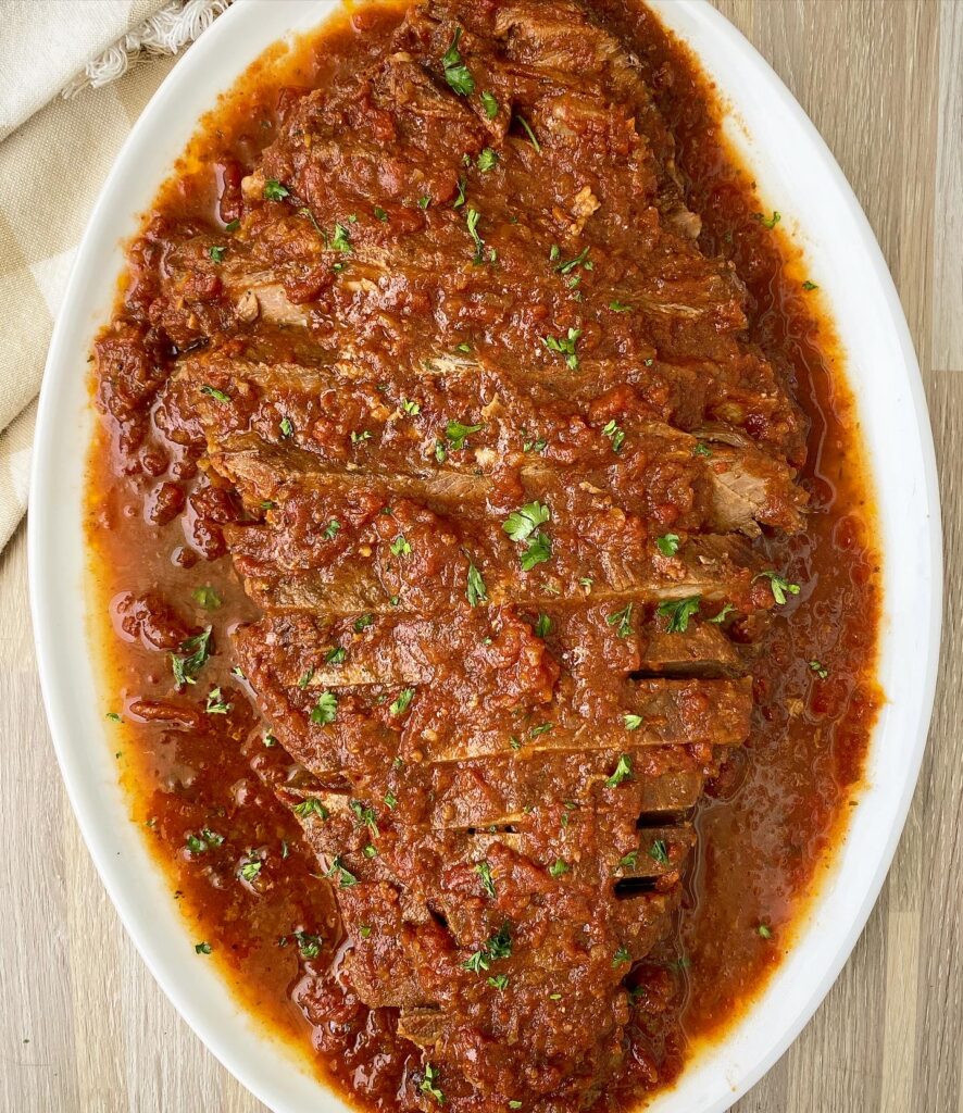 This easy brisket recipe is the perfect addition to any holiday menu. A homemade simple, tomato-based sauce cooks over the